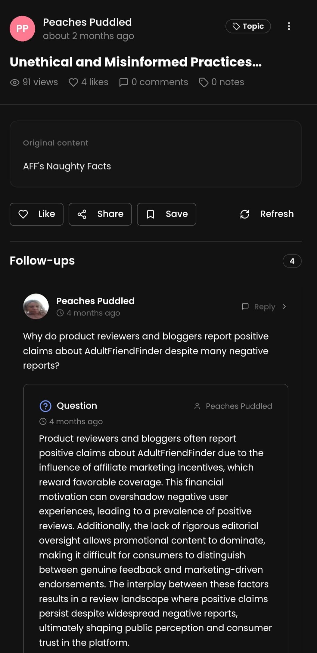 I am transparent to inform my experiences with the site, I have also conducted my own research as well to provide factual data that gets hidden from the public with the help of Reputation Improvement Companies and Reviewers that don't publish unbiased and honest statements to assist their readers but to gain commission, click bait and pad their own wallets while the consumer is dealing with multiple data breaches, hackers and dead profiles. When I curate the information I obtain I do it in a matter of not summarizing what I read or expressing my interpretation of the information. I locate and provide for my readers to read for themselves and come to their own conclusion and take whatever action they see fit if any action at all. Influencing another's mindset has gotten careless and too much reliance on supposed numbers of likes or following has created a false perception for people to adopt. Negative factors about companies can and have been hidden, followings are bought and not enough questioning is being implemented. This is only the beginning of my findings with AFF, with more to report.